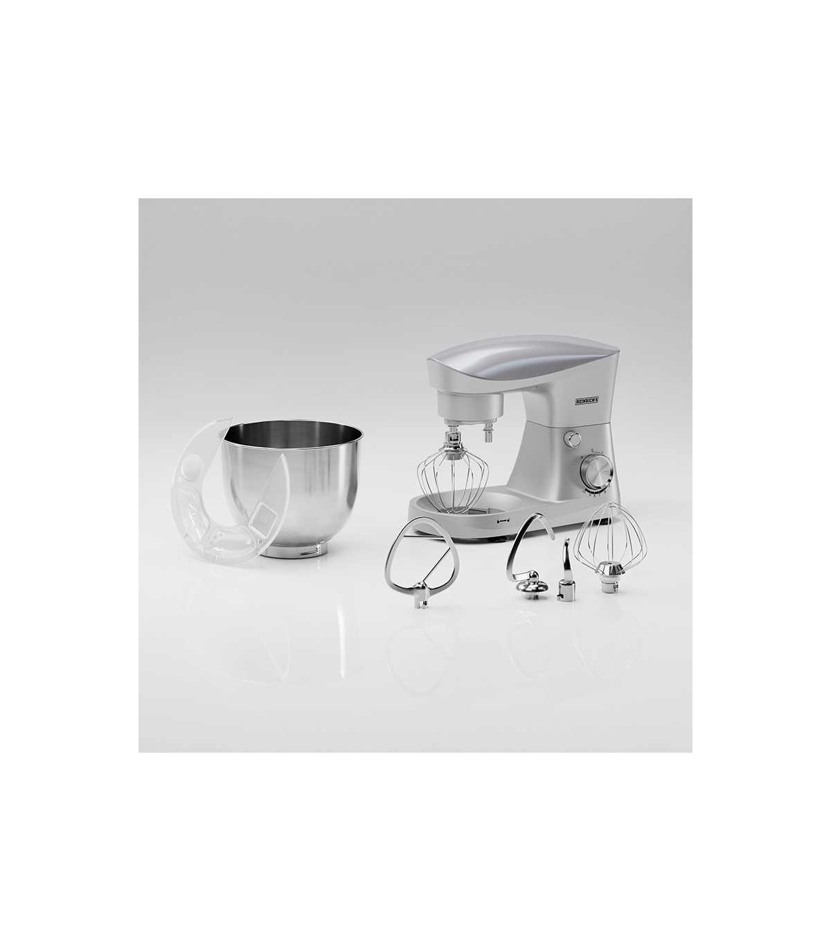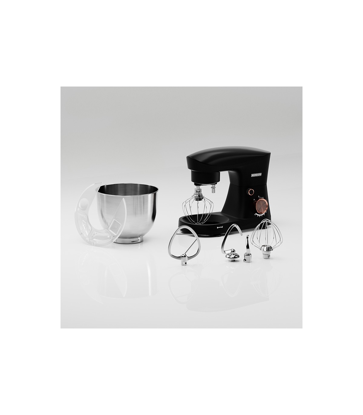 قدرت موتور ۱۵۰۰ وات از طریق گیربکس نسل جدید به سریها منتقل میشود و دو هوک حرفهای به همراه ۴ سری با اتصال فلزی، عملکرد دقیق و حرفهای در آمادهسازی خمیر و مواد مختلف را تضمین میکند. پدل مخلوطکن از آلومینیوم دایکست، خمیرزن از آلومینیوم دایکست و بالونی خامهزن از استیل ضدزنگ با اتصال فلزی ساخته شدهاند تا دوام و عملکرد عالی داشته باشند.